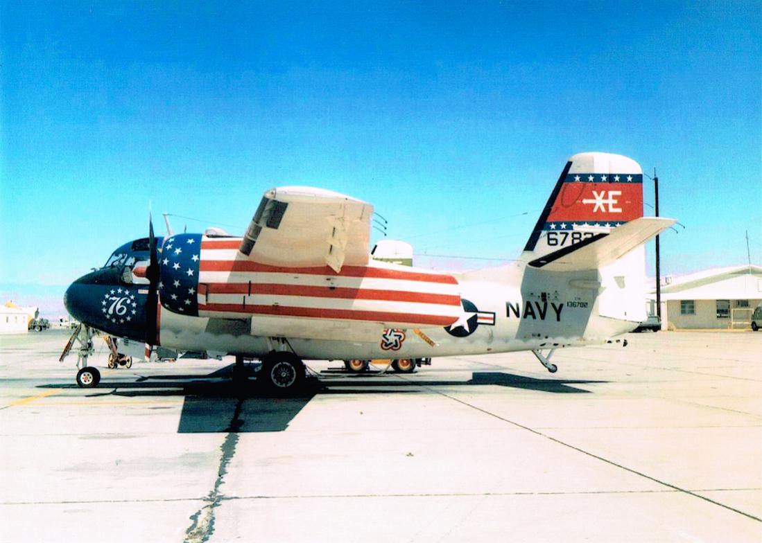 De foto van de bonte Trader moet van 1976 zijn, toen de USA hun Bi-Centennial feest vierde. Veel militaire kisten zijn dat jaar in een jubileumschema gespoten, het logo daarvan staat bij deze C-1 op z'n neus...