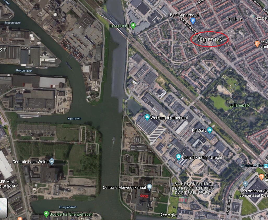 Mijn inschatting is dat de foto vanaf wijk Elinkwijk is genomen. De kenmerkende 3 schoorstenen, die vanaf 1942 de PEGUS Centrale Merwedekanaal sierden, heb ik rood ingetekend.