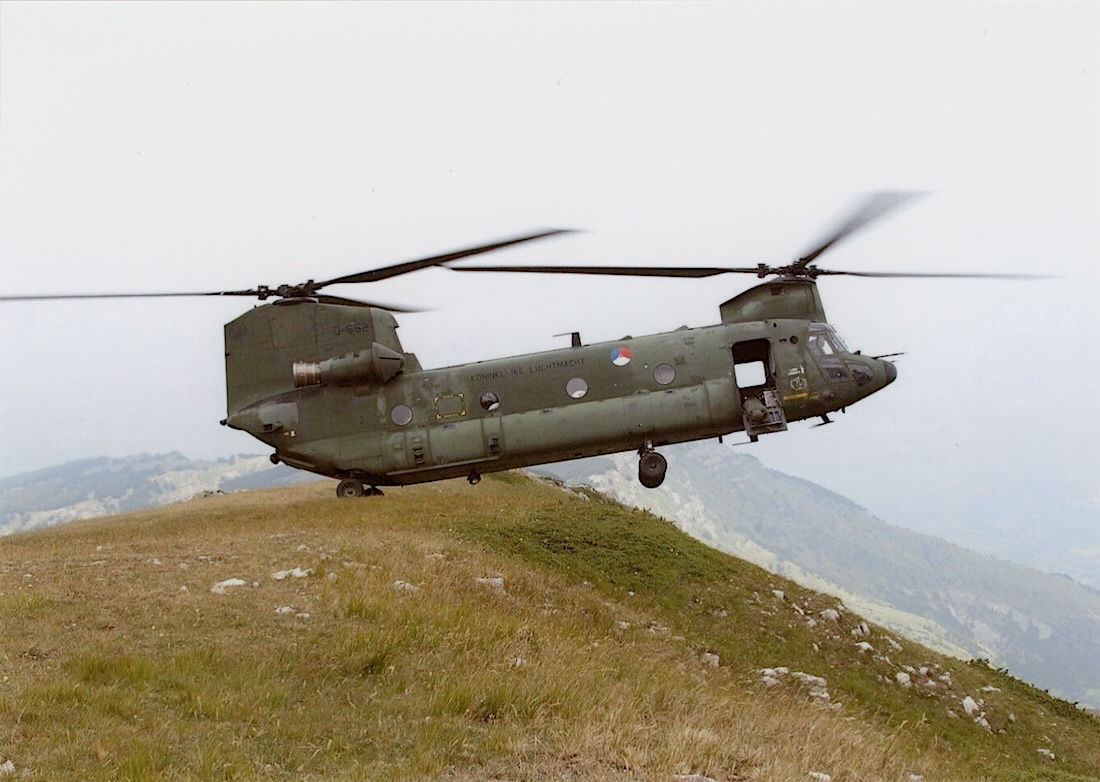 Staat die Chinook nou te balanceren op dat bergkammetje? Het lijkt alsof de achterwielen op de grond steunen, terwijl het neus landingsgestel door de front rotor in de lucht wordt gehouden. Goed vliegerschap dus.