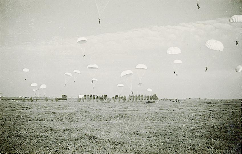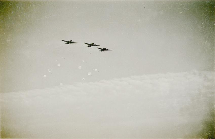 Tekststrip: Het neerkomen op de grond. Strijen 10-15 Mei 1940.