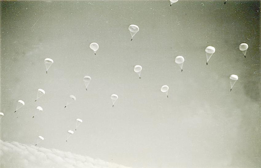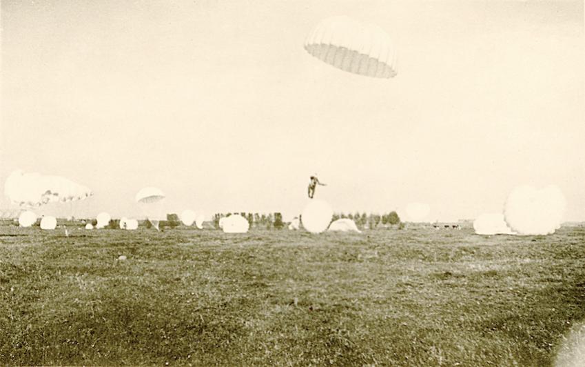 Tekststrip: Het uitwerpen der parachutisten boven de brug. 10-15 Mei 1940. Tekst achterzijde: Sprong uit de machines 10-15 Mei 1940. Moerdijkbrug.