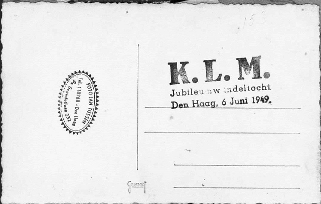 Op de achterzijde is te lezen "K.L.M. Jubileumwandeltocht, Den Haag, 6 juni 1949".