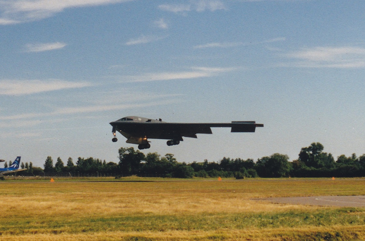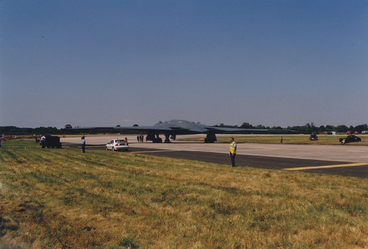 Op de onderste foto van de B-2 ziet men om de zoveel meter een "oppasser" staan die het publiek in de gaten houden, waarschijnlijk om voorkomen dat al te enthousiaste spotters over de hekken klimmen.