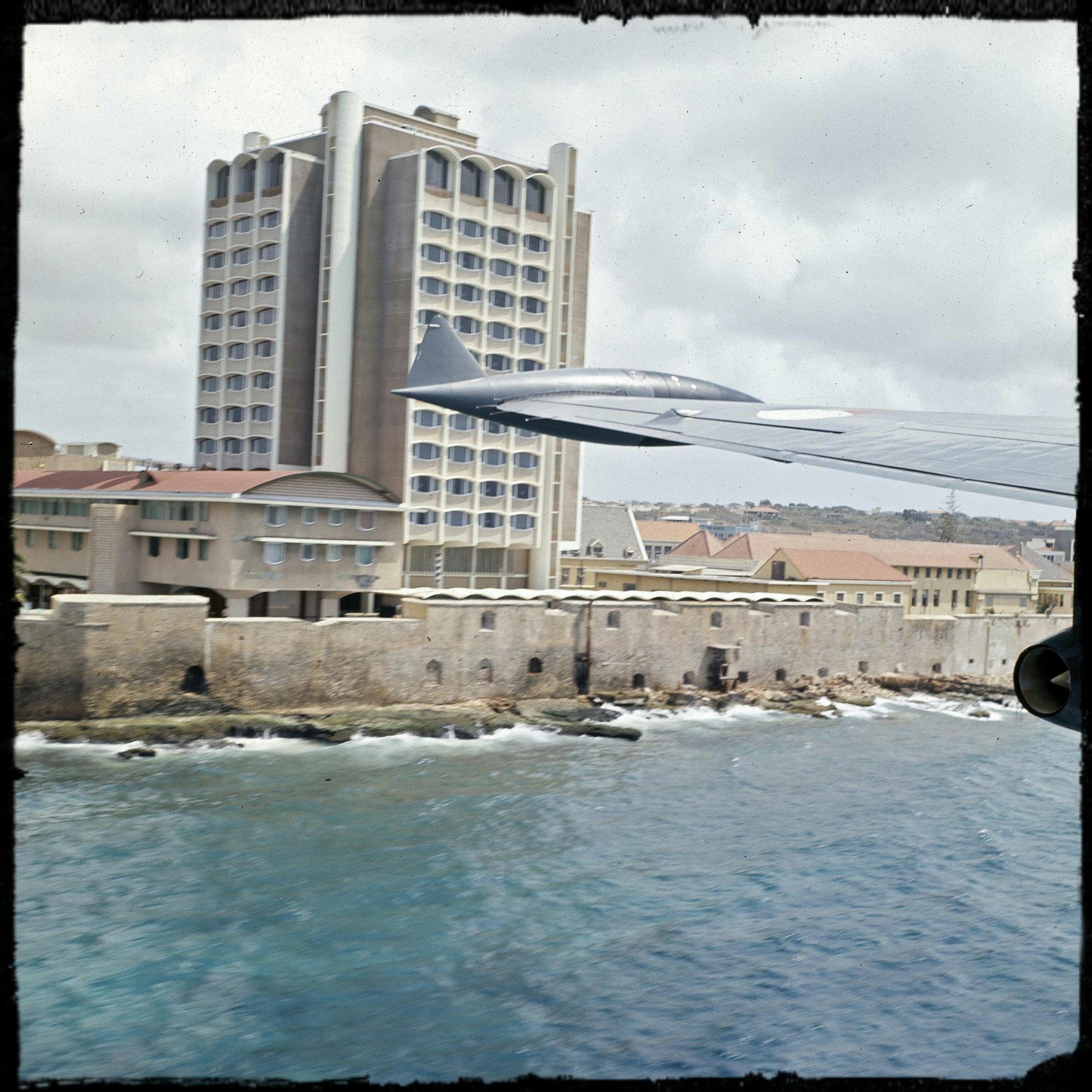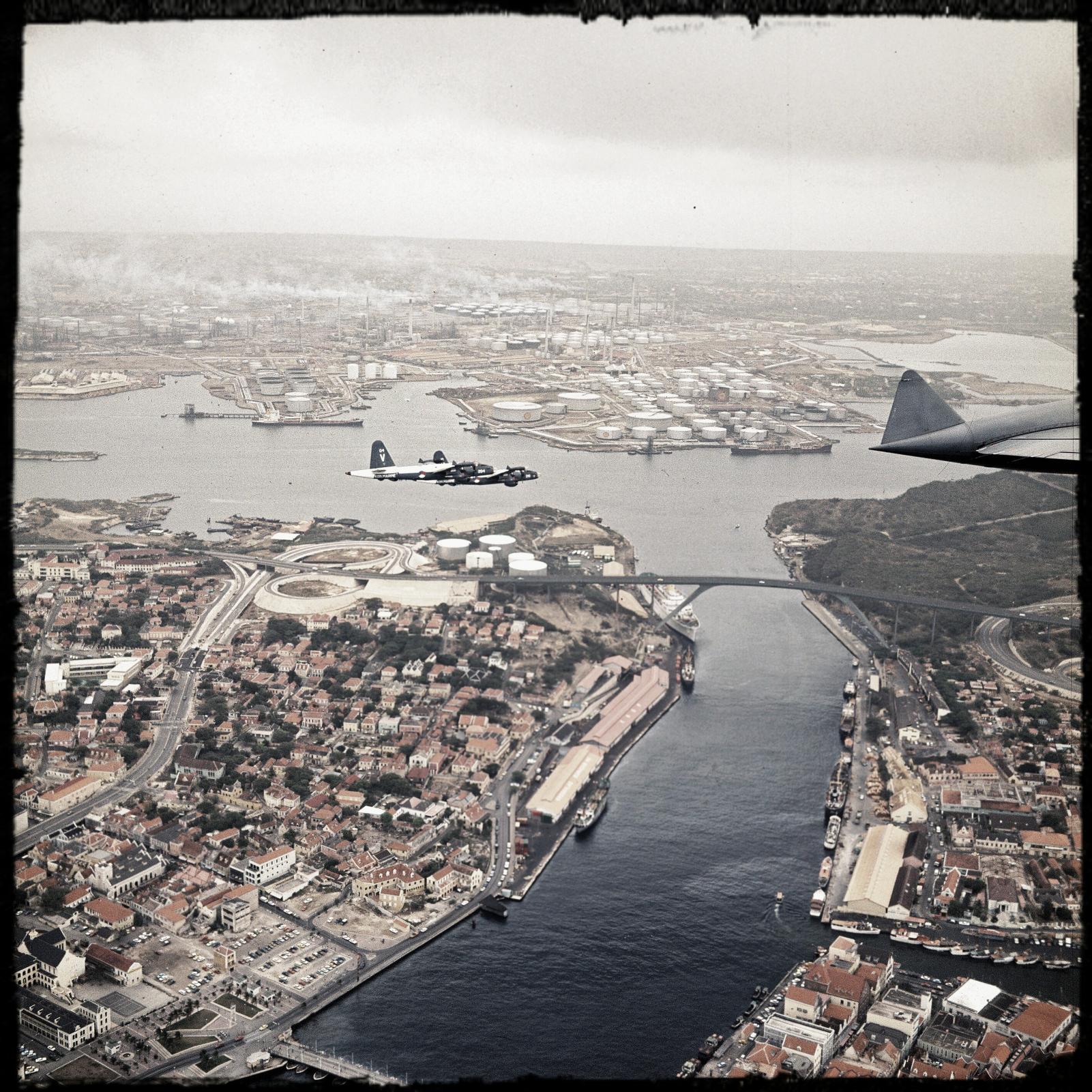 Neptune laag vliegend in de haven ingang van Willemstad N A