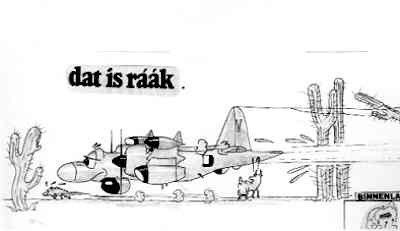 Het gebeurde in de Antillen wel dat een Neptune erg laag over de San Pedro vlakte vloog en dan maakt de cartoonist (Wispelaer) er dit van