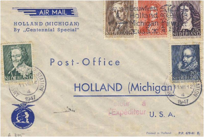Het stadje Holland in Michigan USA vierde op 11 t/m 13 Augustus 1947 haar honderdjarig bestaan. Het stadje werd gesticht door Nederlandse emigranten in 1847. Er bestaat nog steeds een sterke Hollandse invloed. Er is bv. elk jaar een tulpen festival. De KLM besteedde bijzondere aandacht aan de ‘centennial’ in 1947. Op 11 Augustus van dat jaar was er ’n extra vlucht Amsterdam – Grand Rapids (Michigan) . De vlucht werd uitgevoerd met L049 Lockheed Constellation PH-TEO ‘Overloon’ . Het toestel kreeg de tijdelijke naam ‘Holland Michigan’ en de KLM gaf een speciale envelop voor verzamelaars uit. De vliegers van de PH-TEO waren Hakkenberg en George.