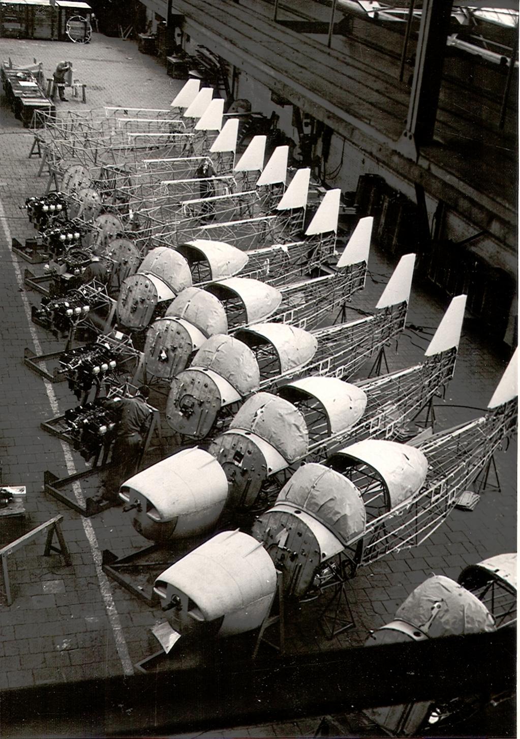 Bij de eerste nog kale motor is iemand de beplating aan het voorbereiden, en verderop terug in de lijn kijkt iemand of het nog om hetzelfde type motor gaat..