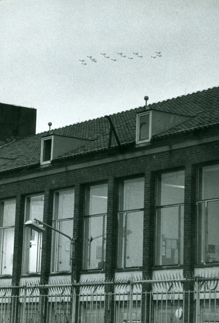 We stonden voor een streng gebouw, op een Koninginnedag, lang geleden.