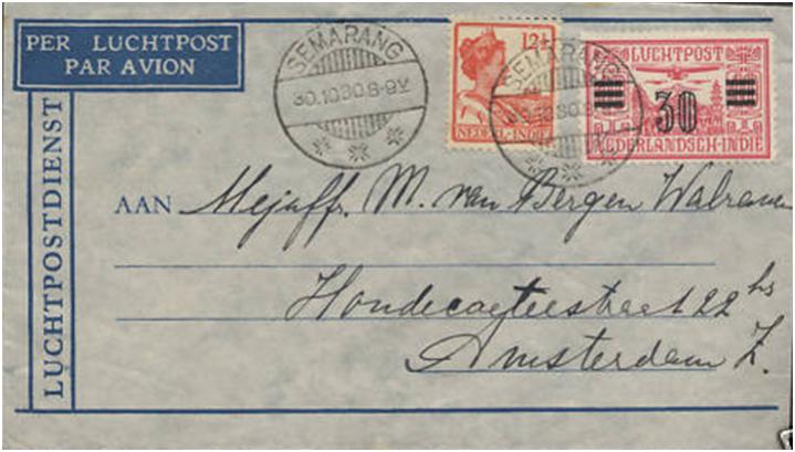 De regelmatige 14 daagse post/lijn dienst op het toenmalige Indië begon in september 1930. Hier is een kopie van de poster waarmee de KLM reclame maakte. Als je goed kijkt is de cockpit gesloten. De Fokker F-VIIB-3M die voor de eerste vluchten gebruikt werd had een open cockpit. Of dit een artistieke vrijheid van de artiest was of een toekomstdroom van de KLM weet ik niet: