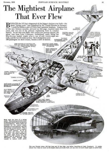 Op 12 juli 1929 startte de DO-X voor de eerste keer onder het dreunen van haar 12 motoren van het Bodenmeer op de grens van Duitsland en Zwitserland. Het vliegtuig had 3 afzonderlijke dekken. De cabine van de gezagvoerder leek meer op die van een schip dan die van een vliegtuig. De bemanning was de commandant, de vliegtuigbestuurder, een technicus, een navigator en een telegrafist. De vliegboot was het grootste van zijn tijd. De watergekoelde Siemens Jupiter twaalf cilinder motoren, elk van 525 pk, waren in 6 groepen in tandem geplaatst. Het stuurwiel was groot en rond als van een schip. De motoren waren geplaatst op pylons, zoals op deze foto duidelijk te zien is: