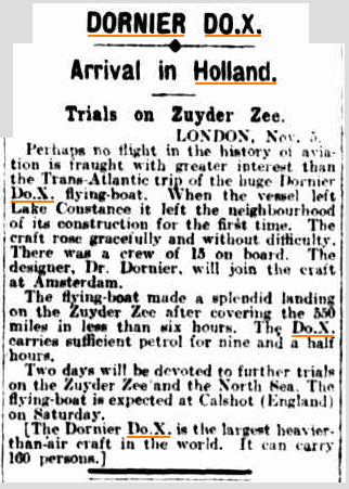 De kranten stonden er vol van: ‘DO-X te Schellingwoude aangekomen’. Niet alleen in Nederland maar over de hele wereld bv. in ‘The Argus’ (Australië):