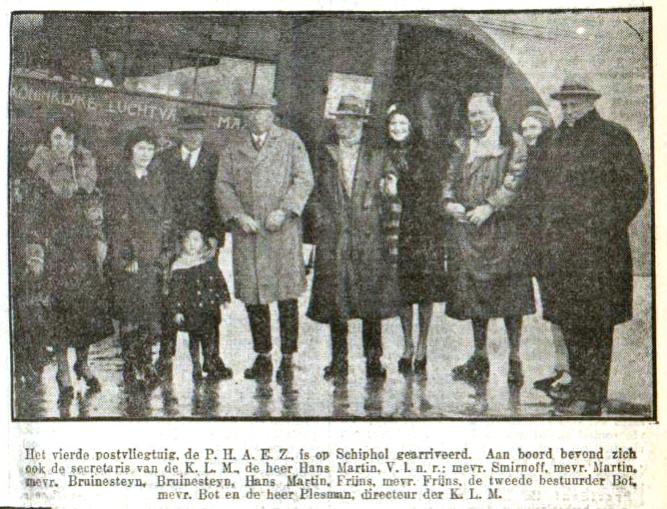 Wij beginnen met de aankomst van KLM Fokker PH-AEZ die een dag eerder op Schiphol was geland. Aan boord was de KLM directeur Martin (ook bekend van het schrijven van romans). Die had een maandenlange onderzoeksreis achter de rug om de route naar Indië en Malakka te onderzoeken. Hij maakte gebruik van bijna alle vervoersmiddelen (vliegtuig, boot trein, auto) om landingsplaatsen en voorzieningen te controleren. Informatie voor de latere vliegtochten dus. Hij was in Indië in de KLM Fokker F7-3M gestapt en vertelde de reporters dat hij een fijne reis had gemaakt.