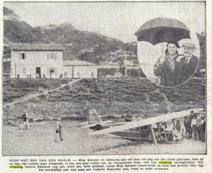 In het Algemeen Handelsblad vertelde men over de noodlanding van Mrs Spooner. Ik had er nog nooit van gehoord maar in de U.K. schijnt het een bekende vlieger te zijn geweest. Ze kon in ieder geval behoorlijk zwemmen en dat is altijd makkelijk als je veel over zee vliegt met een eenmotorig vliegtuigje.