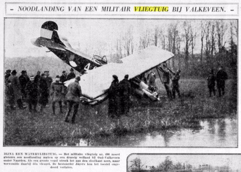 De volgende 2 knipsels zijn uit 'De Telegraaf' en 'De Tijd'. Het gaat over een Fokkertje van de militaire luchtvaart dienst die een noodlanding moest maken. De piloot kwam er goed van af. Hij kon zelfs nog glimlachen.