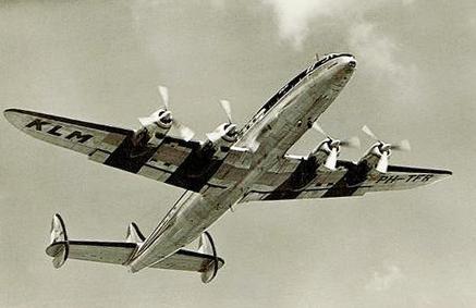 Een Connie die overvliegt, met onder de linker vleugel de registratie, maar onder de rechter de maatschappijnaam. KLM.