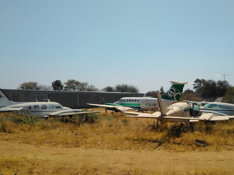 Links (V5-POC) een Piper-31 Navajo, dan D2-END (Beech 200 Super King Air), bruin toestel is een Cessna-310, net als die blauwe daar rechts van. Dan daarachter zo te zien 3 Beech Barons.