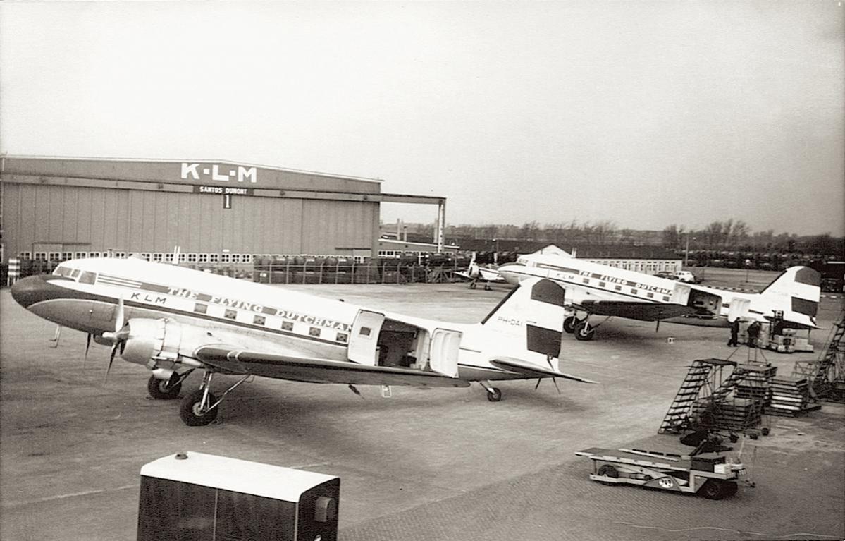 Platform Schiphol met o.a. Douglas DC-4/C-54 PH-TDM (PH-DBM) “Aalsmeer” en Douglas DC-6 PH-TPI (PH-DPI/PH-DPE) “Prinses Irene”.