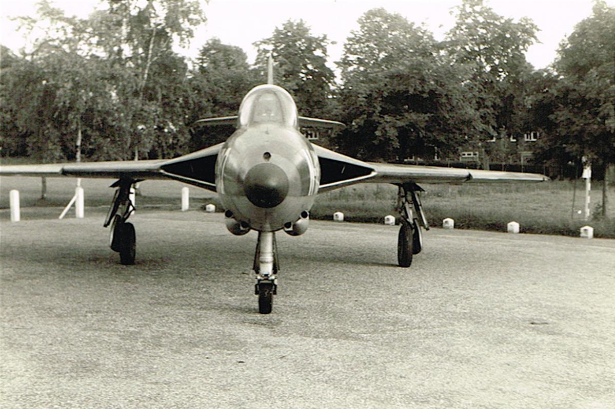 Dus heb ik tijdens de basistraining van 3 maanden, opgekomen 1 april (geen grap) 1962, nog zo’n drie weken de Meteor meegemaakt en daarna zo’n 10 weken de Hunter. Verrassend want dat is niet blijven hangen bij me. Dan is de (onscherpe) kleurenfoto gemaakt tussen 1 en 24 april 1962. Waarschijnlijk in het weekend gemaakt want je mocht in het begin van de opleiding de weekeinden nog niet naar huis en moest je binnen het kazerneterrein jezelf vermaken. Lummelde je dus ook wat over het terrein. Hoeveel weekenden "binnenblijven" verplicht was weet ik niet meer. Wel leuk dat het 325 Squadron het eerste squadron was van de Hunter, het squadron waar ik na de opleiding terecht kwam, op Soesterberg.