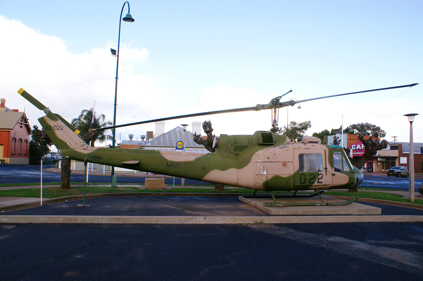 Nyngan, Australie. 15 juli 2009. Bell 204, het toestel was gebruikt bij de evacuaties na een overstroming.