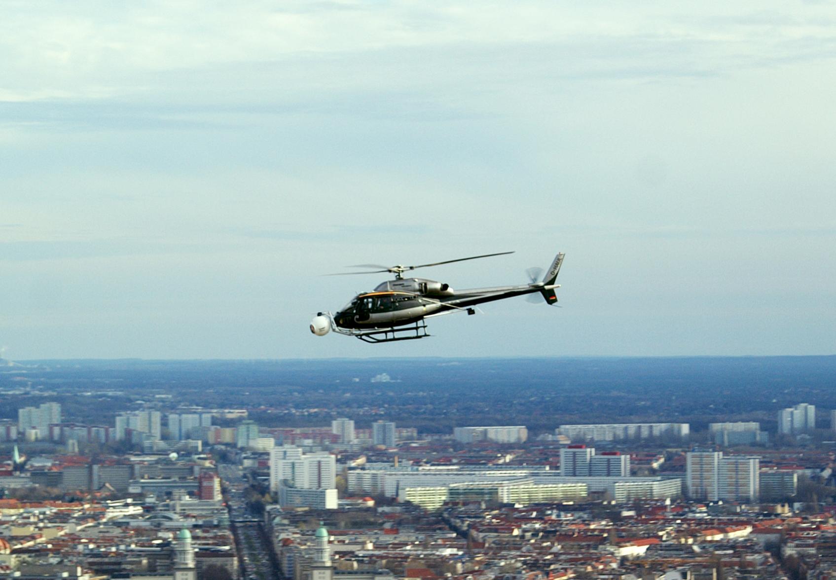 Zit je lekker te eten boven in de Fernsehturm in Berlijn komt deze AS350 (denk ik) voorbij. Vooral de enorme camera bol is opvallend