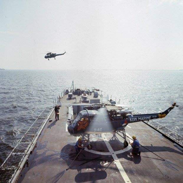 Het zijdelings afvliegen van de Wasp helicopter vanaf een fregat