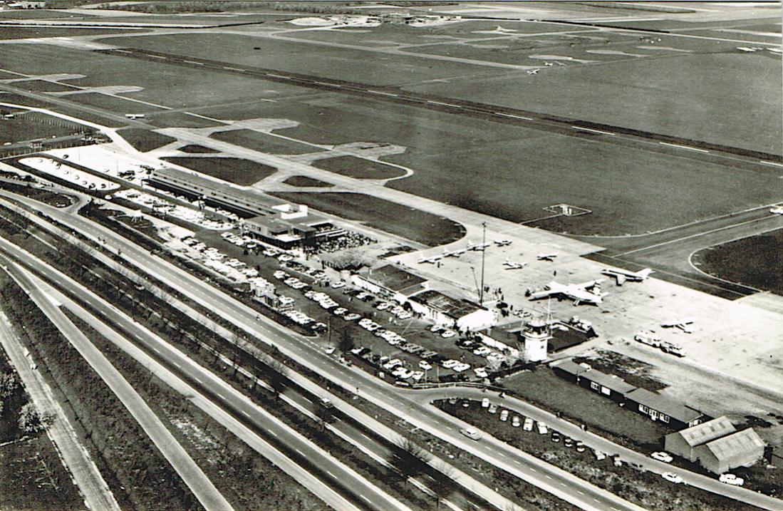 Luchtfoto van Luchthaven Zuid-Limburg (nu Maastricht Aachen Airport).