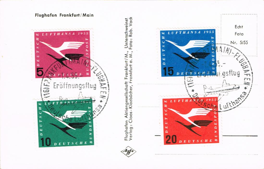 Kaart 711. Deze kaart, uitgegeven door de Deutsche Bundespost, is me niet helemaal duidelijk. Dit lijkt mij geen inaugurale vlucht van de KLM op 1.4.1955 naar Frankfurt/Main maar meer een kaart die is uitgegeven vanwege het feit dat de Lufthansa vanaf 1.4.1955 weer toestemming had boven West-Duits grondgebied te vliegen en daarmee ook weer binnenlandse vluchten uit te voeren hoewel het dan vreemd is dat er een Nederlands toestel op de kaart is gebruikt. Anderhalve maand later ging de Lufthansa ook weer europees en transatlantisch vliegen.