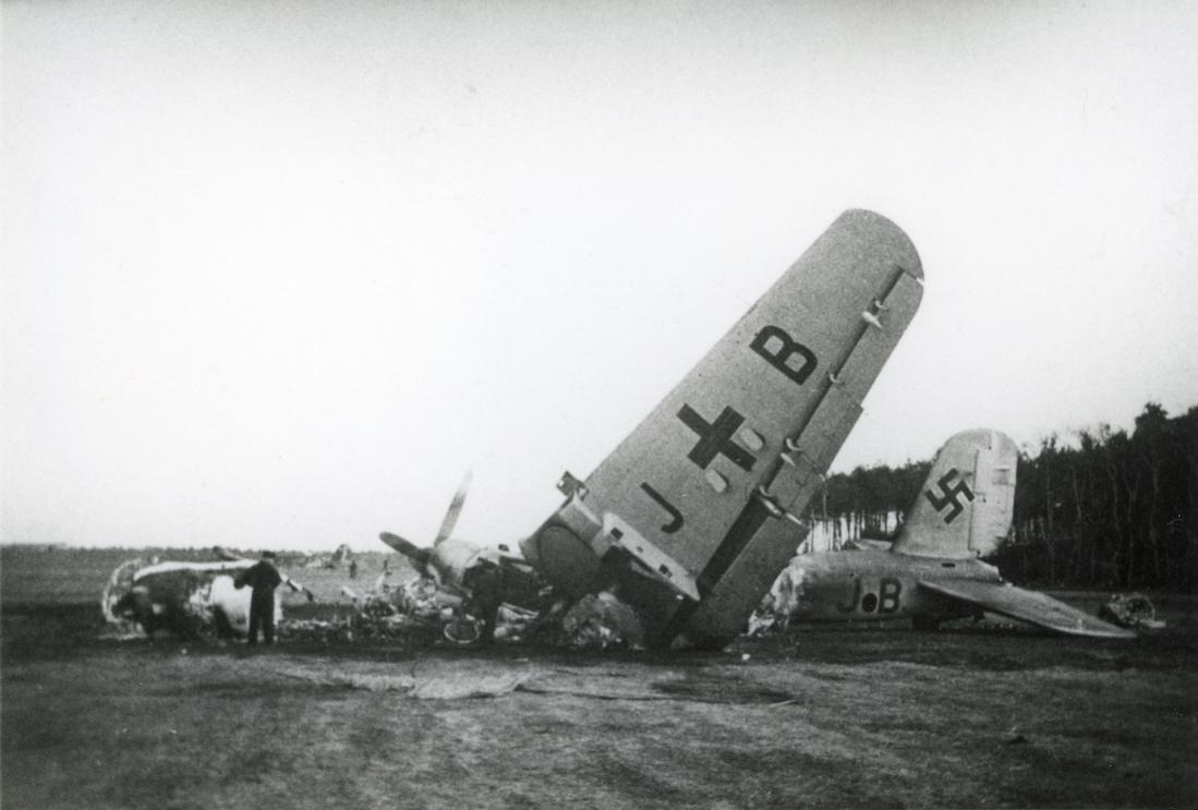 Ik heb het even met een Zweedse expert besproken en dit is een bekende foto. De foto werd na de overname door de Britse troepen gemaakt. In de voorgrond een Duitse Ju 88, maar in de achtergrond een aantal Britse jachtvliegtuigen en transportvliegtuigen. In het midden van de foto in de lucht vliegt nog een ander vliegtuig waqr de mensen op het dak van de hangaar naar staan te kijken. De Deense luchtvaarthistoricus Hans Kofoed schrijft dat de foto niet op Sylt, maar op Kopenhagen/Kastrup is genomen. En wel op het zuidelijke gedeelte van de luchthaven. Dato: 1 juli 1945, toen de RAF een air show gaf op de Kastrup met 250.000 bezoekers. Er was onder andere een aanval met een Hawker Typhoon, die een in de Öresund gelegen Blohm & Voss Bv 138 kapot schoot. Tijdens de show werd ook de Gloster Meteor Mk III gepreseneerd. De Zweedse machine is van stafchef Nordenskiöld die uitgenodigd was. Hij kreeg een escorte van Hawker Typhoons van Malmö naar Kopenhagen. Dit werd bevestigd door Torsten Höjrup, in een Zweeds tijdschrift. Torste werkte toen als verkeersleider op Malmö/Bulltofta.