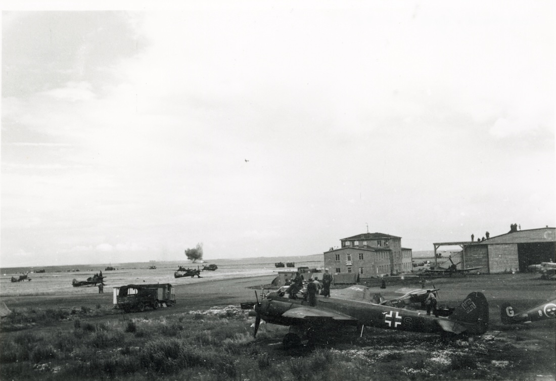 Maar wat doet het Zweedse jachtvliegtuig FFVS J 22, rechts nog net te zien, op dit eiland op dat moment?