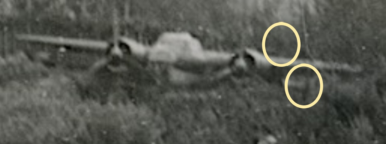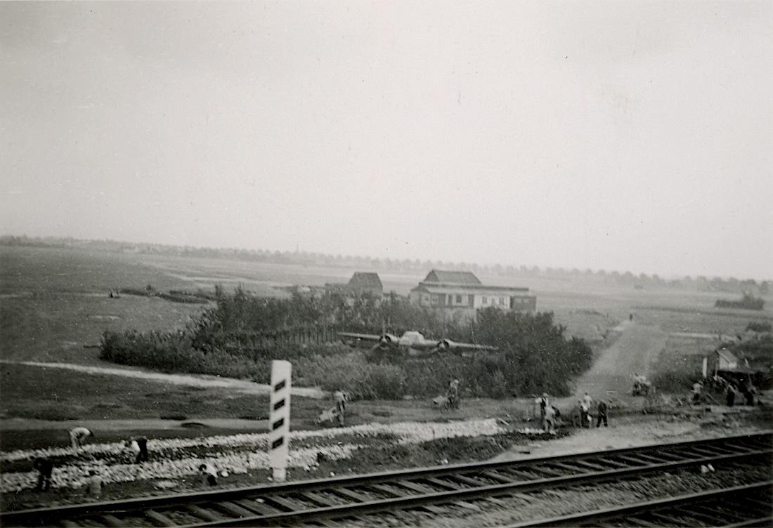 Het vliegtuig lijkt op een gecamoufleerde opstelplaats te staan, maar lijkt helemaal ingesloten door bomen en struikgewas. Vreemd. Ook geen camouflage boven het vliegtuig; zoals het er nu staat is het vanuit de lucht nog steeds goed zichtbaar. De spoorlijn (dubbel spoor) lijkt hoger te liggen dan het omringende terrein en er zijn arbeiders aan het werk met iets dat op verharding van een weg lijkt. Een vliegveld in aanleg, of eentje die uitgebreid wordt? Uit een boek over de NS in oorlogstijd leerde ik recent dat veel Luftwaffe-vliegvelden in Nederland een aansluiting op het spoorwegnet hadden. Maar die waren meestal enkelsporig.