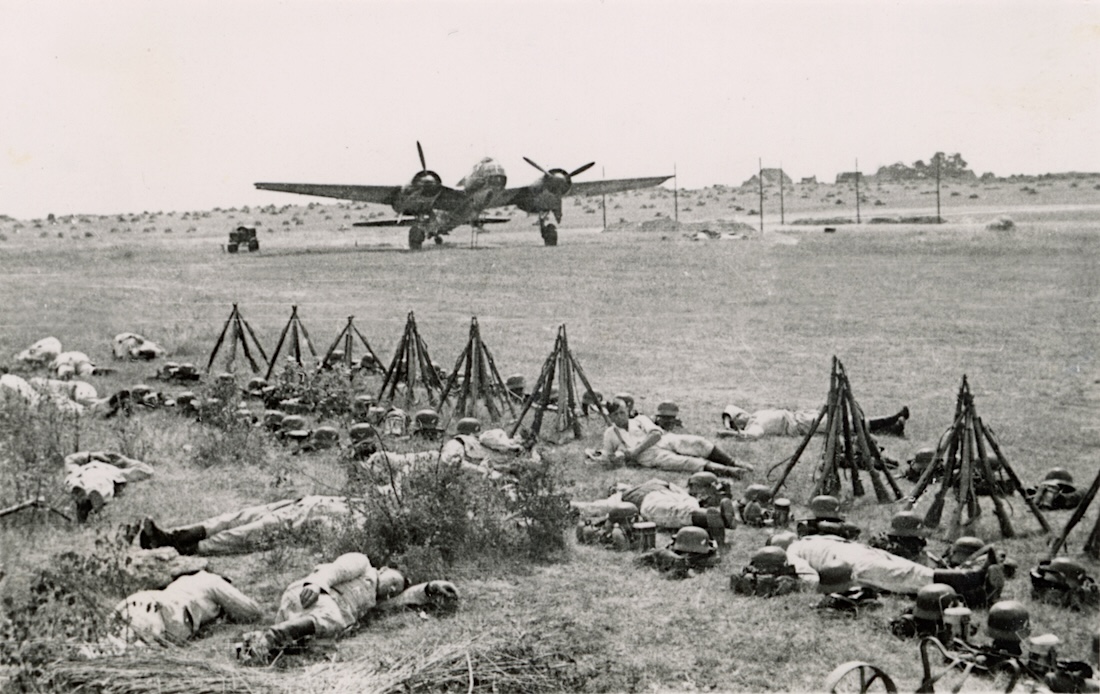 Junkers Ju 88 op een vliegveld waarbij het grondpersoneel een rustpauze heeft ingelast.