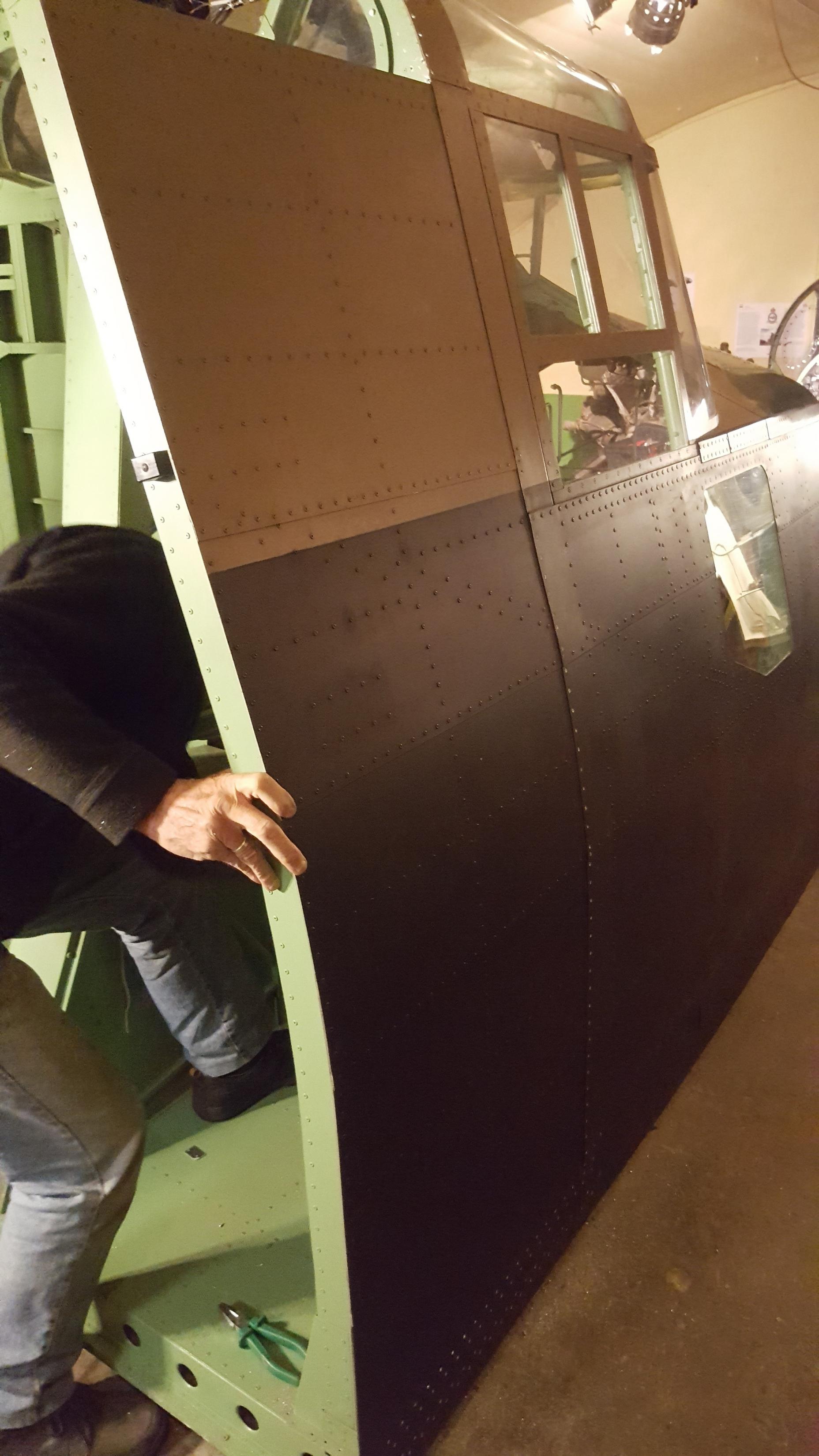 Ik ben bezig met een handleiding (heb inmiddels al 18 pagina's) en honderden foto's die het team in Engeland gaan vertellen hoe alles weer in elkaar past. Maar het is een enorme klus om alles netjes te demonteren. Elke klinknagel heeft zich in twee lagen aluminium vastgezet zoals het hoort maar daardoor klemt de boel nadat de nagel is uitgeboort. Dus elk gat moet voorzichtig worden losgewrikt zonder beschadiging.
