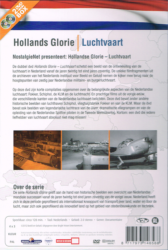 "Hollands Glorie | Luchtvaart" van NostalgieNet (BVED4656). Speelduur 128 min. Bevat diverse docu's, zie hieronder.