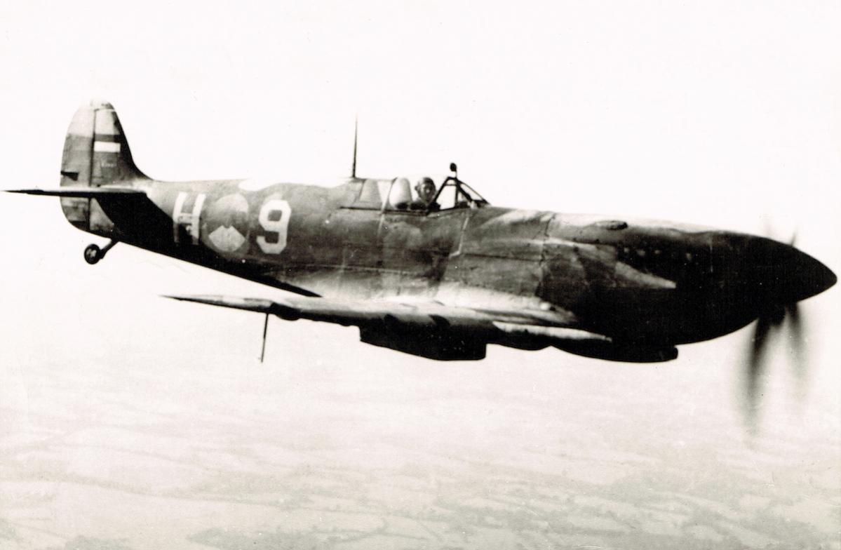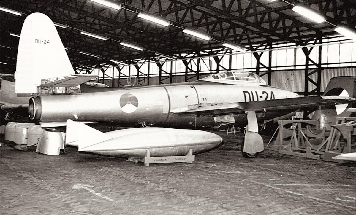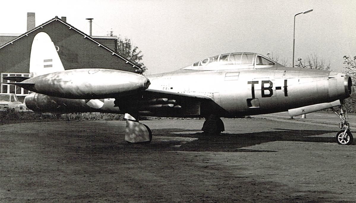 Afgaande op de tactische kleur lichtblauw op de neus- en staartcone en het staartvlak plus de rode neus zou ik zeggen dat dit een Meteor van 323 squadron is. Daarbij hoort de squadroncode Y9. Het originele vliegtuignummer '5' is nog te lezen op de neuswieldeur. Het zou dus Y9-5 moeten zijn. Omdat de '5' op de romp inderdaad nogal wat frivool is vermoed ik dat de kist uit de organieke sterkte is afgevoerd.