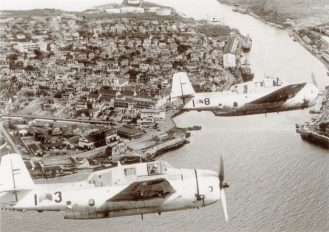 Grumman TBM-3S 'A-3' en 'A-8' in formatie boven de Sint Annabaai richting Punda.
