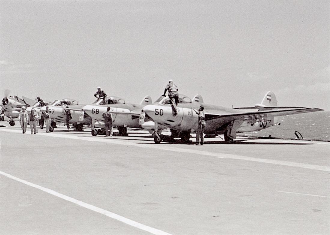 Rij Hawker FGA-50 Seahawks aan boord met Grumman TBM-3W2 Avenger op achtergrond.