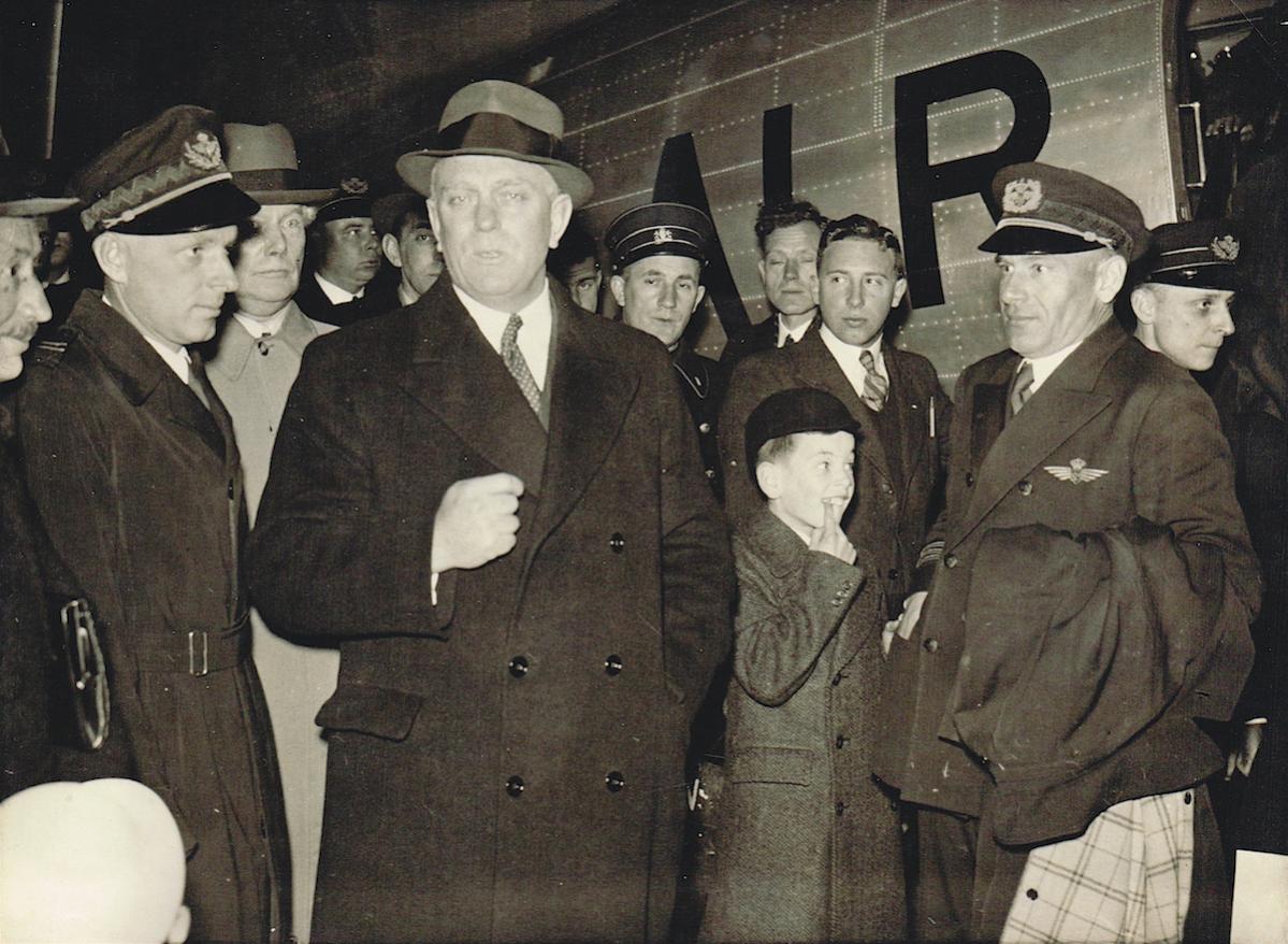 HET 500STE RETOURVLIEGTUIG OP SCHIPHOL. - Gisteren arriveerde uit Indië op het vliegveld Schiphol het 500ste retourvliegtuig van de K.L.M. „De Reiger", met als gezagvoerder de heer E. H. Hulsebos. De heer A. Plesman, directeur van de K.L.M, sprak de bemanning toe, rechts de gezagvoerder van „De Reiger", de heer E. H. Hulsebos, en links van den heer Plesman de directeur-generaal der P.T.T., Dr. Ir. M. H. Damme.