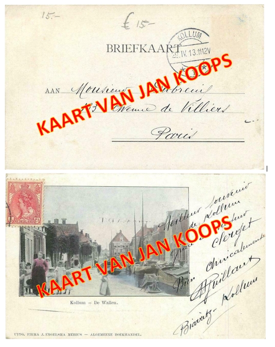 Ik heb een originele door Guillaux verzonden kaart uit Kollum, eveneens afgestempeld op 29 april 1913, waarop ook op de voorzijde een postzegel was geplakt (evenals op de gebruikelijke adreszijde).