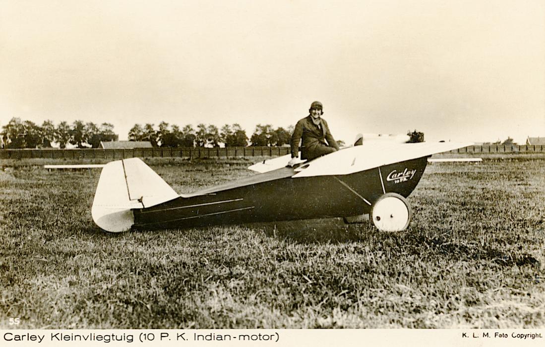 Carly Kleinvliegtuig (10 P.K. Indian-motor). Deze prentbriefkaart bestaat ook met de tekst Carley 'Baby' met 10 H.P. Indian' motor op de hoogte van het getal 55 linksonder op deze kaart 802.