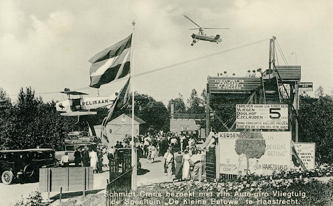 Schmidt Crans bezoekt met zijn Auto-giro Vliegtuig de Speeltuin "De Kleine Betuwe" te Haastrecht.