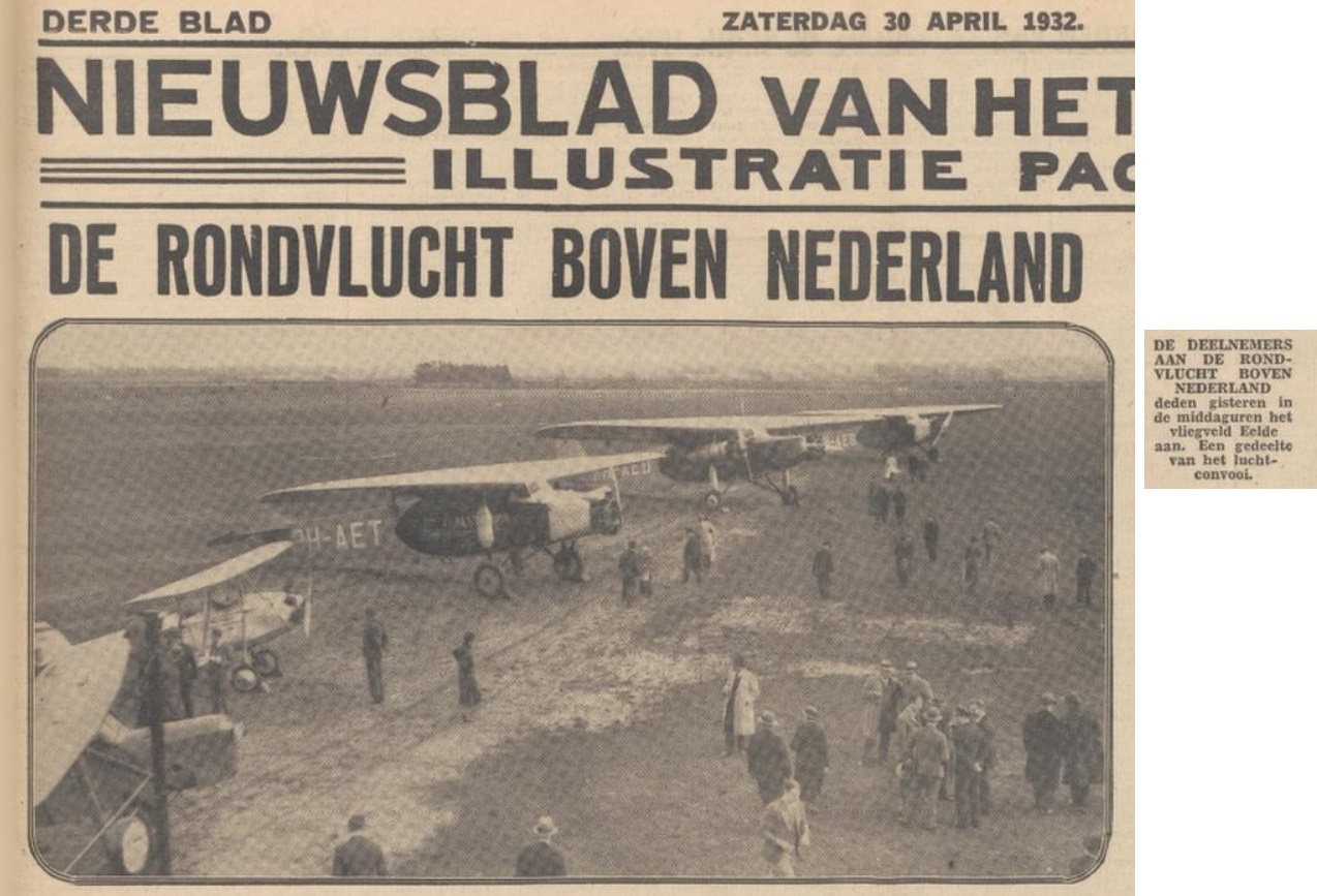 Foto's genomen bij de Eerste Nederlandse Rondvlucht. Deze foto in Het Nieuwsblad van het Noorden is net weer anders. Het Noorden was heel trots op Eelde, want er werd bijna een hele pagina met foto's aan gewijd. Karel