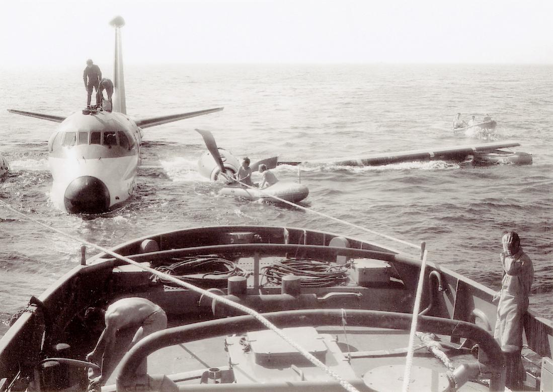 15.08.1973. Breguet Atlantic '257' op 1,5 km west van Wassenaar in zee geland wordt klaar gemaakt voor sleep naar Den Helder.