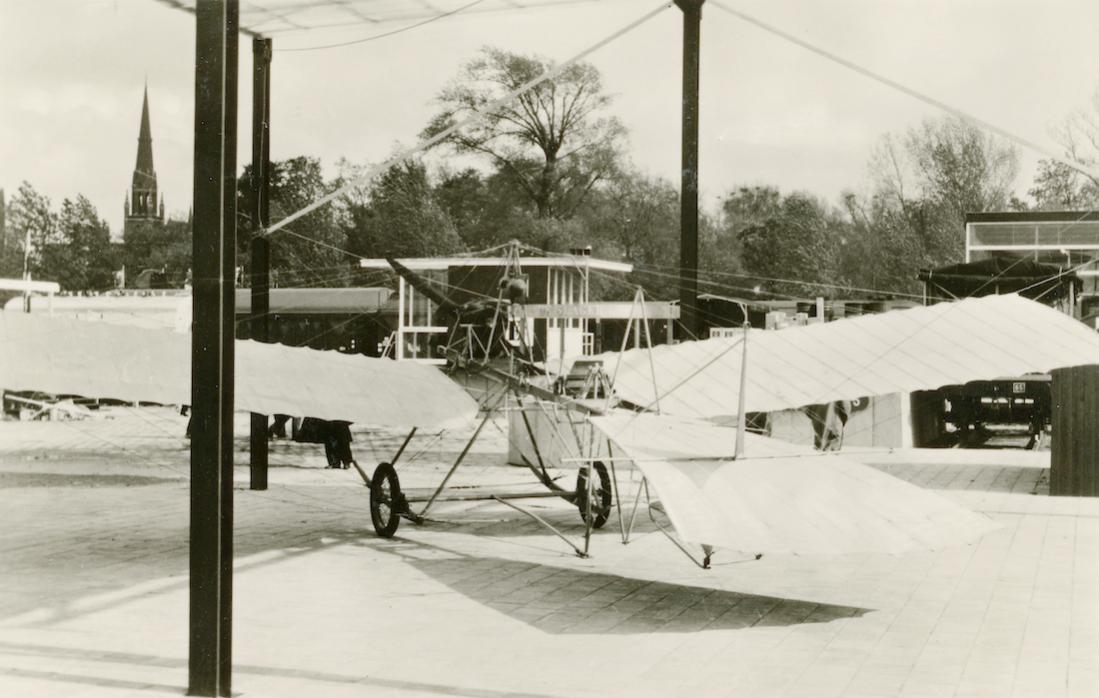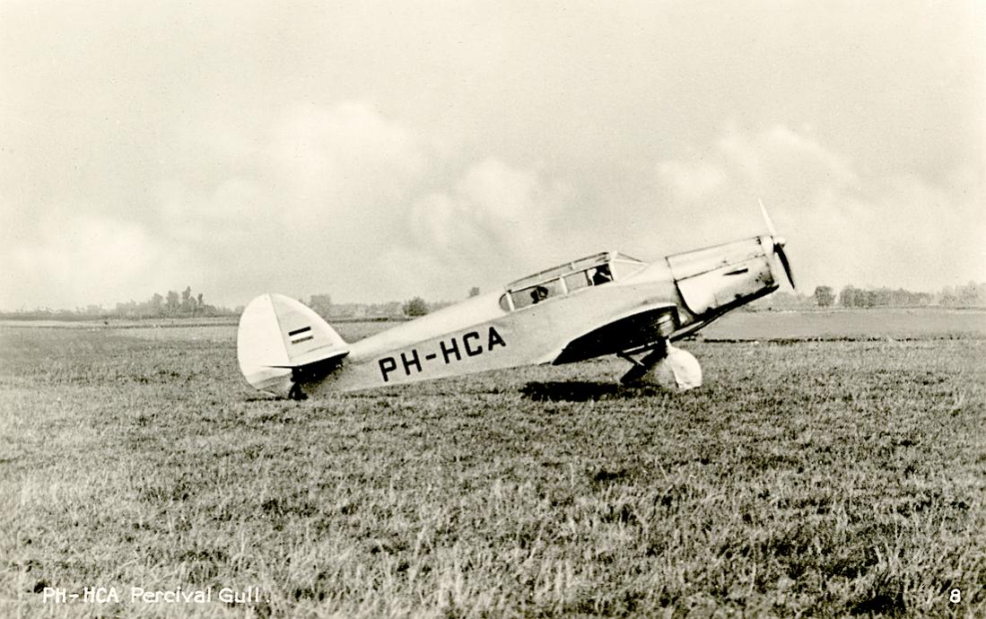 'H-NABV'. Fokker F.III boven de haven Waalhaven vlak voor de landing op het vliegveld.