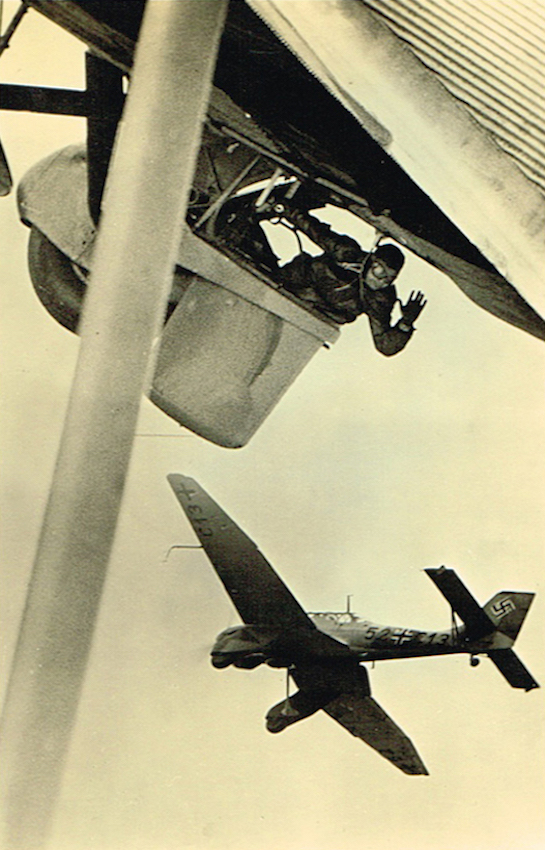 De gondel onder de vroege Ju 52 is eerder onderwerp van discussie geweest op dit topic. Hier een opname van zo'n 'Gondeltopf' maar dan bemand.
