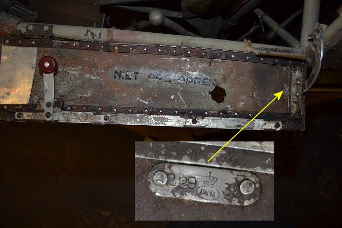 In het deurtje (niet opstappen) bleek een plaatje te zijn gemonteerd met daarop het toestel nummer, het bouwjaar en een gekroonde stempel.