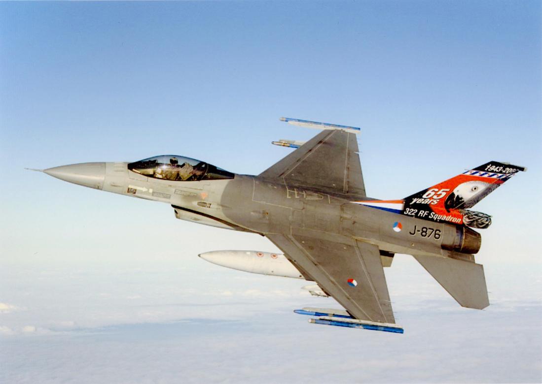 'J-876'. General Dynamics F-16A MLU met speciale staartbeschildering ter gelegenheid van het 65-jarig bestaan van 322 Squadron.