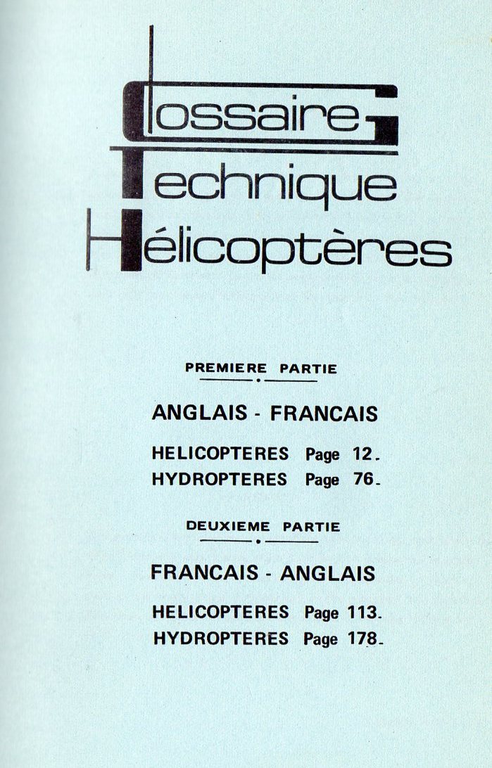 Bij het doorsnuffelen van mijn bibliotheek vond ik een boekje uit mijn werkzame periode. Dit werkje werd uitgegeven door de helicopter fabriek 'Aerospatiale' (later Eurocopters). Het laat alle onderdelen en technische termen in zowel Franse als Engels naast elkaar zien, dus er kan in de algemene luchtvaart ook gebruik van gemaakt worden. Het boekje is een beetje verfomfaaid maar heel bruikbaar. Ik stel het gratis beschikbaar. Dus als iemand het wil hebben laat het dan weten. Als je het per post wil toegestuurd hebben, dan is de porto 3,45 euro. Afhalen kan natuurlijk ook. Janjr.