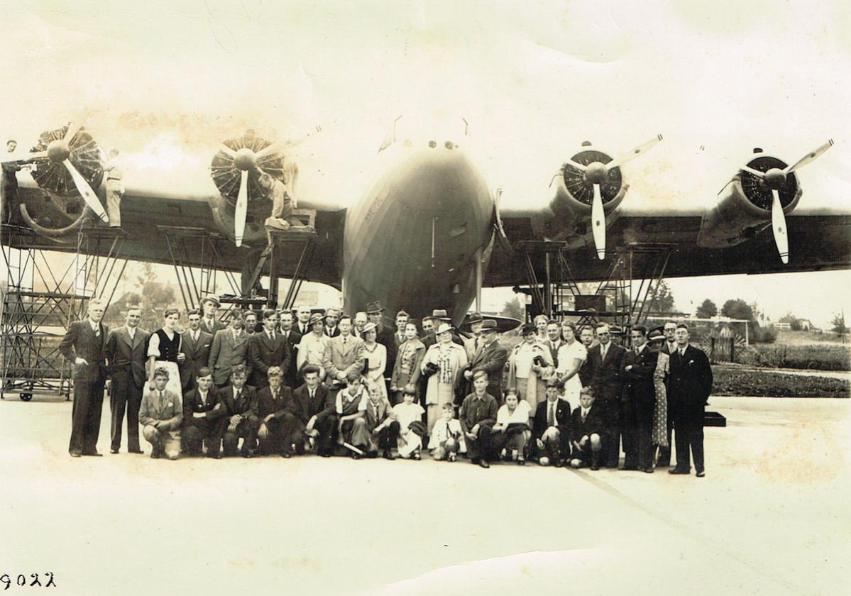 Monteurs plegen onderhoud aan de motoren van de F.XXXVI. Het gezelschap op de voorgrond heeft waarschijnlijk een rondleiding gehad.