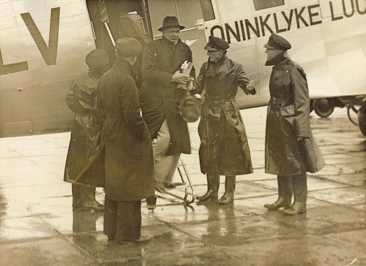 Aankomst Plesman met de PH-ALV 'Valk' (DC-3) op regenachtig Schiphol. Let eens op de kleding van enige heren. Hoog water in de polder?