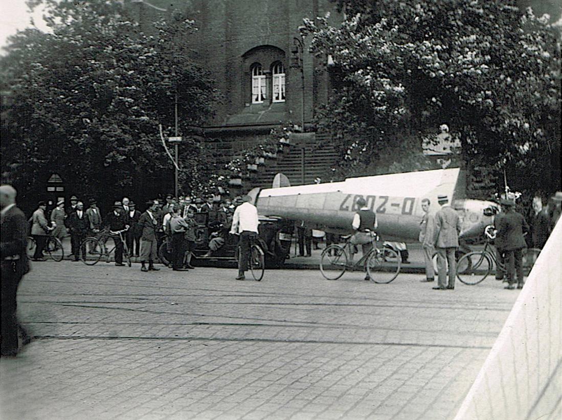 Foto 407. Klemm Kl 25b bij de watertoren in Essen heeft geen gebrek aan belangstelling.